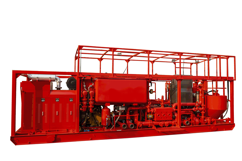 Установка для цементирования представляет собой оборудование для закачки цемента. Она оснащена горизонтальным трехплунжерным насосом одностороннего действия, установленным на салазках. Во время работы плунжерный насос приводится в действие дизельным двигателем на салазках. Оборудование оснащено системой смешивания цементного раствора с функцией его рециркуляции. Работа всей машины осуществляется с помощью электрической системы, гидравлической системы, пневматической системы и механической системы передачи. Все органы управления сосредоточены на пульте управления, что делает эксплуатацию простой и надежной. Установка для цементирования на раме в основном используется для операций по цементированию глубоких, средних и неглубоких скважин на нефтяных месторождениях. Она может выполнять такие работы, как самостоятельное приготовление цементного раствора, тампонаж, замена раствора, достижение скачка давления и т.д. Её также можно использовать для промывки скважин и проведения ГРП в неглубоких скважин.